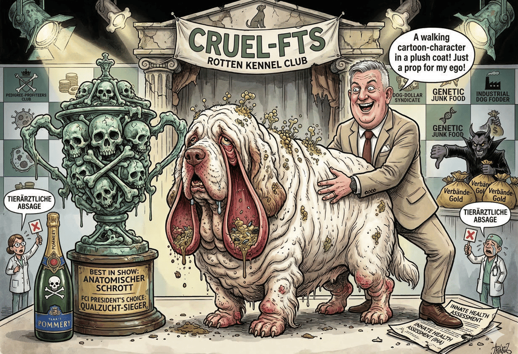 Um dieses kynologische Trauerspiel in seiner vollen, absurden Pracht zu verstehen, müssen wir uns die verbandspolitische Heuchelei dahinter einmal genauer auf der Zunge zergehen lassen. Ausrichter der Crufts ist der britische Royal Kennel Club (RKC) unter Chairman Ian Seath – ein Mann, der sich in der Szene aktuell gerne als großer Reformer im Kampf gegen Extremzuchten feiern lässt und ein neues Gesundheits-Rahmenwerk ausgerufen hat. Und was macht dieser angebliche Reform-Club? Er lädt ausgerechnet den amtierenden FCI-Präsidenten Dr. Tamás Jakkel als Gastrichter für das wichtigste Finale des Jahres ein.2 Dieser wählt dann aus über 18.600 Hunden 1 ein Tier zum Sieger, dessen Phänotyp in der modernen Veterinärmedizin als absolutes Paradebeispiel für anatomische Extreme, schwere Hautfalten und hängende Lider steht.3 Die Doppelmoral trieft hier wirklich aus jeder Pore.